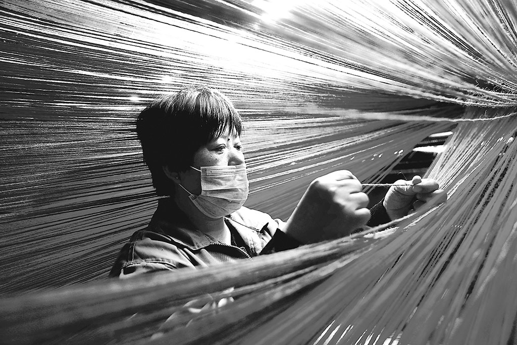 在惠民縣桑落墅鎮(zhèn)“惠民工坊”,工作人員在針織機(jī)前整理線軸。