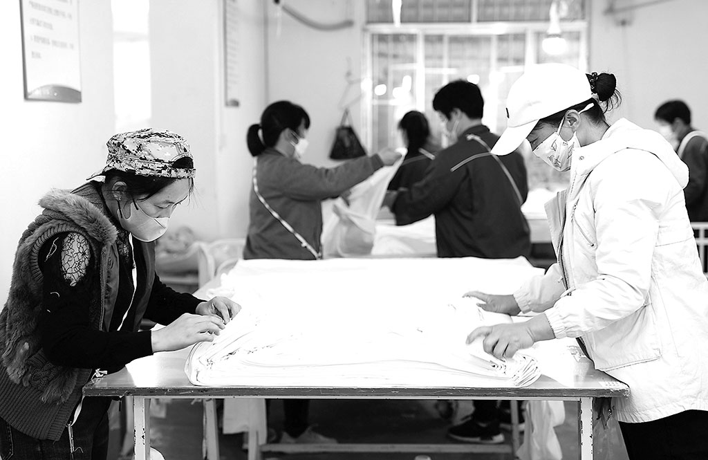 在惠民縣胡集鎮(zhèn)“惠民工坊”,工作人員在整理紡織產(chǎn)品上的線頭。