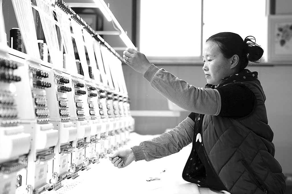 在惠民縣桑落墅鎮(zhèn)“惠民工坊”,工作人員在針織機(jī)前修剪線頭。