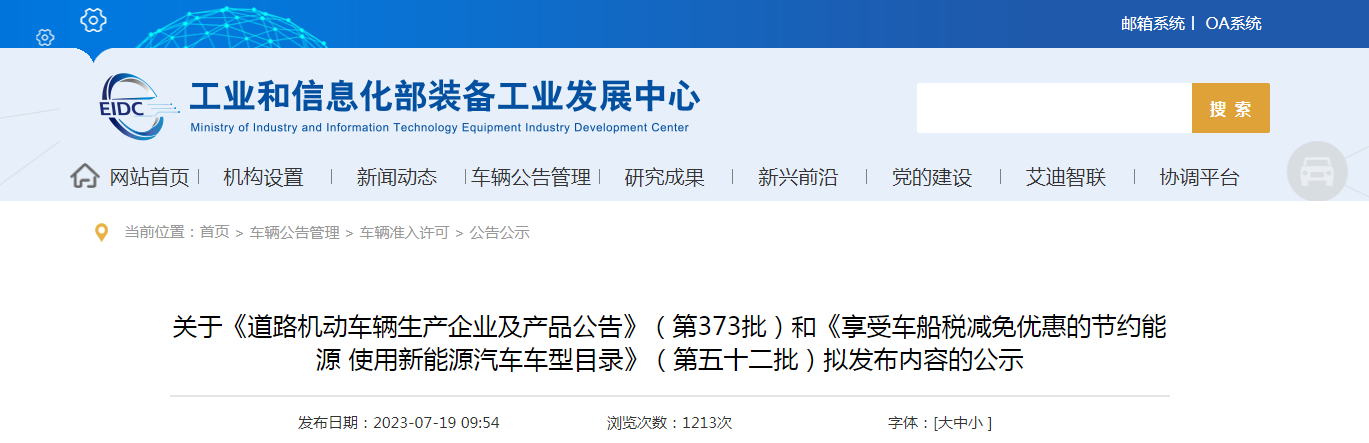 關(guān)于《道路機(jī)動車輛生產(chǎn)企業(yè)及產(chǎn)品公告》(第373批)和《享受車船稅減免優(yōu)惠的節(jié)約能源 使用新能源汽車車型目錄》(第五十二批)擬發(fā)布內(nèi)容的公示