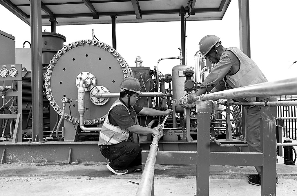 圖為工人在張掖某示范項(xiàng)目調(diào)試氫氣加壓裝置。金良快 攝