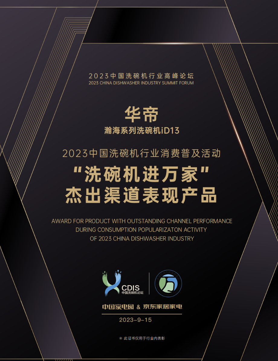 9月15日,“中國洗碗機(jī)消費(fèi)普及活動(dòng)7.0”的PART2“2023中國洗碗機(jī)行業(yè)高峰論壇”將在北京隆重舉行。論壇現(xiàn)場,華帝巨能洗洗碗機(jī) JWB17-B7獲選本次活動(dòng)“洗碗機(jī)進(jìn)萬家”優(yōu)選產(chǎn)品,瀚海系列洗碗機(jī)iD13獲選“洗碗機(jī)進(jìn)萬家”杰出渠道表現(xiàn)產(chǎn)品,品牌被評(píng)為“洗碗機(jī)進(jìn)萬家”優(yōu)選品牌,這是華帝連續(xù)兩年在中國洗碗機(jī)行業(yè)高峰論壇獲獎(jiǎng)。