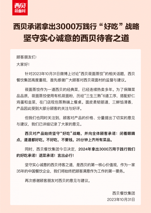 并且,西貝在聲明中再次向全體顧客強調了“閉著眼睛點,道道都好吃。不好吃,不要錢?!钡某兄Z,2024年會拿出3000萬用于踐行退菜承諾,言出必行。
