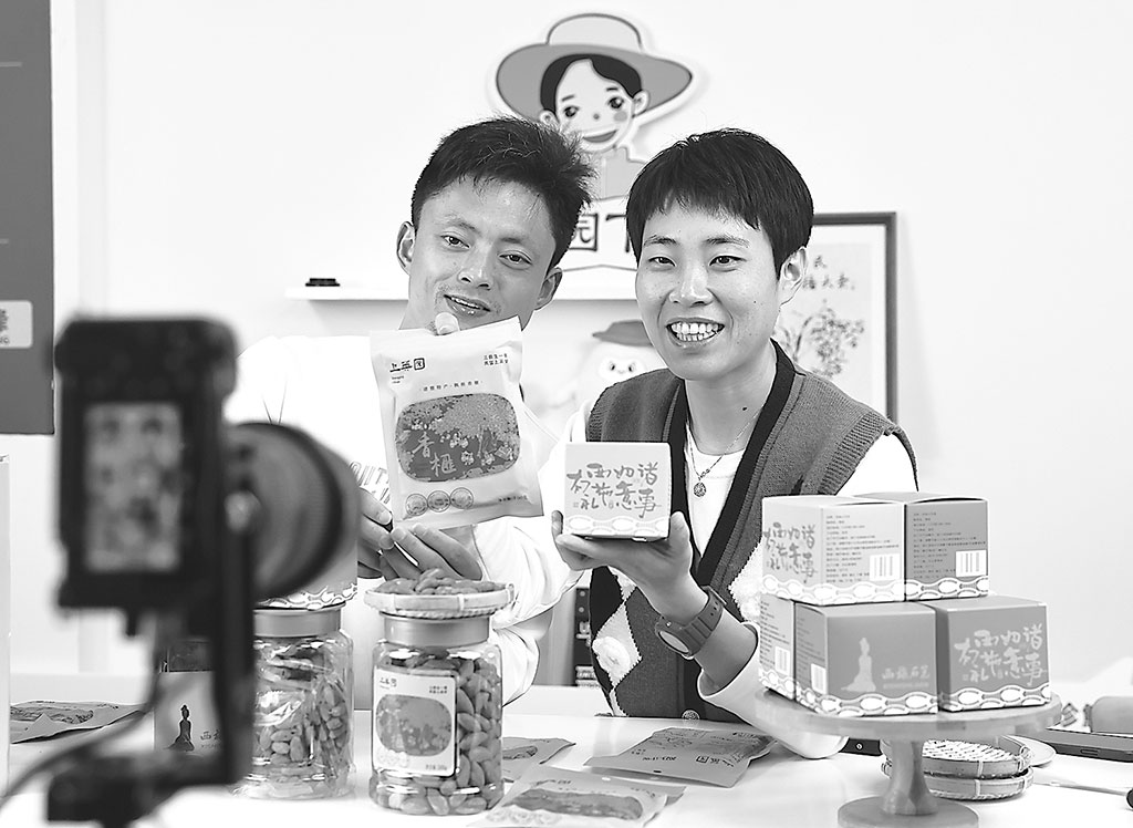 圖為近日,東白湖鎮(zhèn)上英村黨總支書(shū)記趙堅(jiān)均、黨員志愿者莊園(右)在“上英園夢(mèng)”共富工坊直播間銷售香榧。徐 昱 攝