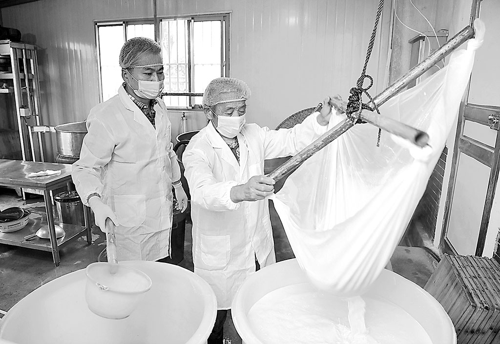 圖為工人們采用民間古法手工技藝制作茶干。過仕寧 攝