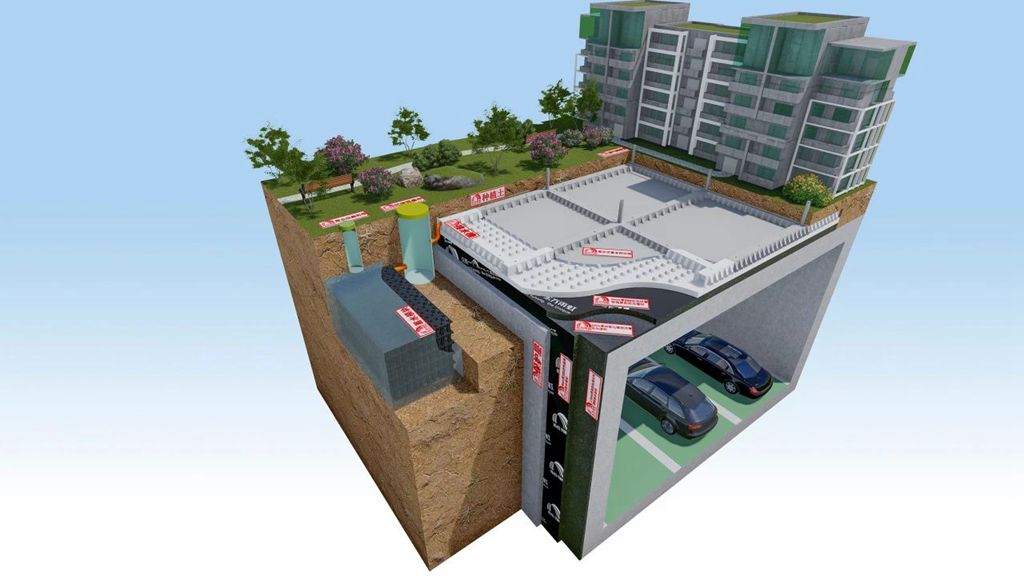 經(jīng)過調(diào)研考察,項目最終選用由防水阻根模塊、排水模塊、雨水利用模塊組成的雨虹桃花源零坡度有組織防排蓄水系統(tǒng)。該系統(tǒng)能夠?qū)⑺畢R集至全封閉的高分子復(fù)合排水板、高強(qiáng)排水槽中,并利用虹吸原理,使雨水在重力、壓力和透氣的作用下,在出水口變徑形成滿流被抽入沉淀觀察井,再經(jīng)沉淀觀察井繼而排入雨水收集系統(tǒng)過濾凈化,循環(huán)利用。由于虹吸排水這一特性,使其在水量不足的情況下依然能夠保持有效運(yùn)作。與傳統(tǒng)重力式排水系統(tǒng)不同,虹吸排水無需依靠水量高低啟動系統(tǒng),能夠解決該地區(qū)降雨量低、水量不足的排水問題。