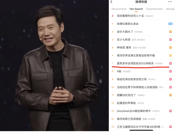 “雷軍穿搭”又上新了!2月27日晚,雷軍身穿一身棕色皮衣出席小米發(fā)布會,“雷軍發(fā)布會同款皮衣5分鐘斷貨”等話題引發(fā)熱議,網(wǎng)友紛紛“求同款”“求雷軍皮衣代餐”。