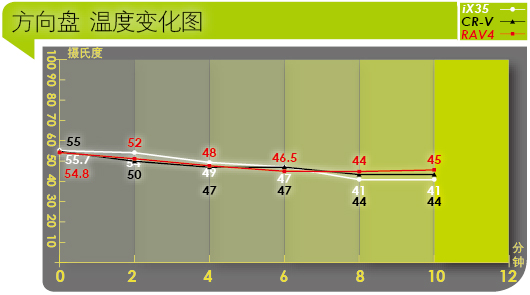 什么位置最涼?答案肯定是出風口。從曲線圖就可以看得出來,ix35的出風口是這3輛車中最涼的,第一次測試(2分鐘后)就達到了18℃,10分鐘后變?yōu)?0℃。但駕駛時,人還是會坐在座椅上,出風口涼不代表整車的溫度就低,畢竟影響溫度的因素還有很多。從曲線圖我們還可以看出,無論是方向盤,還是座椅(主駕駛席),ix35的最終溫度都是最低。