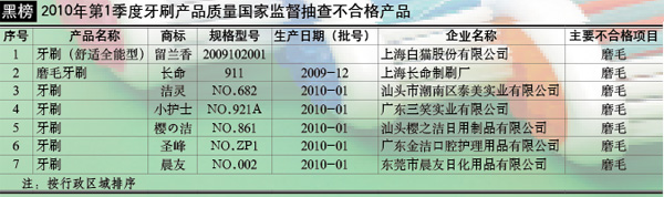 抽查概況:對牙刷產(chǎn)品的衛(wèi)生要求、牙刷(頭、尾)部安全要求、毛束拉力、柄部抗彎力、頸部抗彎力、單絲彎曲恢復(fù)率、磨毛(或磨尖率)、砷、鎘、鉻、鉛、汞等12個項目進行了檢驗。抽查結(jié)果表明,所抽產(chǎn)品中涉及人身健康安全的衛(wèi)生要求、牙刷(頭、尾)部安全要求、砷、鎘、鉻、鉛、汞等重金屬檢驗項目均符合標(biāo)準(zhǔn)要求。本次抽查,有7種產(chǎn)品不合格