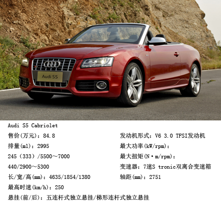 在動(dòng)力配置方面,S5 Cabriolet沒有沿用S5 Coupe的4.2KLV8自然吸氣發(fā)動(dòng)機(jī),而是使用了奧迪更先進(jìn)的3.0LV6燃油直噴機(jī)械增壓發(fā)動(dòng)機(jī)。當(dāng)發(fā)動(dòng)機(jī)運(yùn)行在5500~7000轉(zhuǎn)/分時(shí)可以輸出245千瓦(333馬力)的最大功率,在2900~5300轉(zhuǎn)/分寬泛的轉(zhuǎn)速區(qū)間內(nèi)可以持續(xù)輸出440N·m的峰值扭矩。配合奧迪先進(jìn)的7速Stronic雙離合變速箱,S5 Cabriolet從靜止加速到100km/h的時(shí)間僅需要5.6秒。