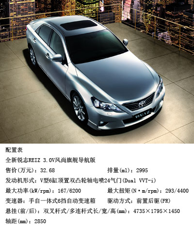 9月16日,豐田全新REIZ銳志轎車(chē)在慈溪上市,作為豐田旗下定位時(shí)尚動(dòng)感的一款車(chē)型,銳志從2005年上市至今便一直受到國(guó)內(nèi)消費(fèi)者的熱捧,這不僅是由于它擁有駕駛樂(lè)趣十足的前置后驅(qū)(FR)車(chē)身,更重要的是它那皇冠級(jí)別的品質(zhì)