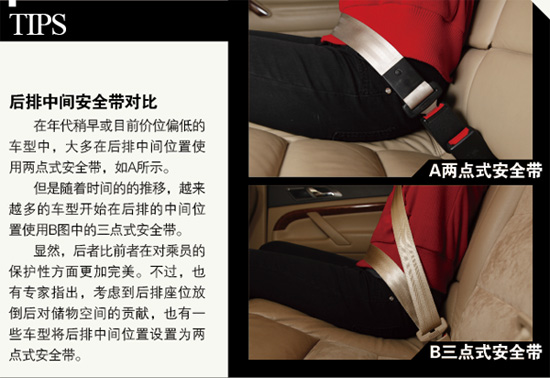 其次是保護(hù)的程度。眾所周知,三點(diǎn)式的安全帶的保護(hù)性要強(qiáng)于兩點(diǎn)式,但是記者在查看中發(fā)現(xiàn),幾乎所有A級(jí)車的后排中間位置都是兩點(diǎn)式安全帶。據(jù)專家介紹,與三點(diǎn)式安全帶相比,兩點(diǎn)式安全帶大約節(jié)省一百多元的成本,對(duì)于那些嚴(yán)格控制成本的入門級(jí)小車,這樣的配置也說得過去。但是B級(jí)車中也不是所有的車型都在后排中間設(shè)置三點(diǎn)式安全帶,比如一汽-大眾的邁騰。