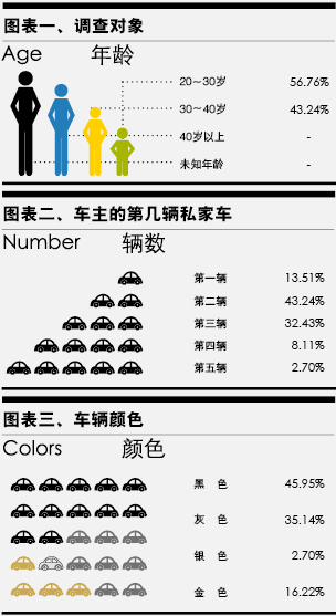 車主在車輛顏色上的選擇也充滿個性化色彩,我們所調查的車主只鐘情于黑、灰、金、銀4色,其中選擇黑色的比例最高,達到45.95%;選擇灰色的其次,達到35.14%;選擇金色的居第三位,達到16.22%(見表三)。