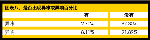作為車主駕乘感受的直接體現(xiàn),車輛舒適性至關重要。針對舒適度,我們專門設計了4個選項問題。在回答“這款車的內飾是否有困擾您的異味問題”的選項時,2.70%的車主做了肯定選擇,而97.30%的車主認為沒有異味。在針對“這款車在行駛過程中(包括剎車時)是否有異常響動”這一選項中,8.11%的車主選擇了“有”,而91.89%的車主則選擇了“沒有”(見表八)。
