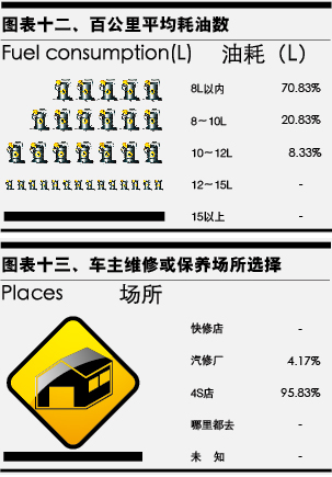 比亞迪G3雖然有1.5L和1.8L兩種排量,但此次參與調(diào)查的車主無一例外地都選擇了1.5L排量的車型。針對“您的汽車在使用過程中的百公里平均油耗數(shù)”這一調(diào)查選項中,選擇在8L以內(nèi)的車主占了絕大多數(shù),達(dá)到70.83%(見表十二)。顯然,選擇1.5L排量的車主是對油價比較敏感的人群,而G3的油耗水平也與車主的訴求相契合。
