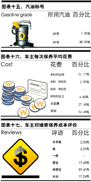 在“維修/保養(yǎng)場所”的選擇上,所有參與調(diào)查的車主都選了在4S店進(jìn)行維護(hù)(見表十四)。另外在燃油標(biāo)號(hào)的選擇上,絕大多數(shù)車主的選擇是97號(hào)油,占比為98.05%,僅有1.95%的車主會(huì)加93號(hào)燃油(見表十五)。