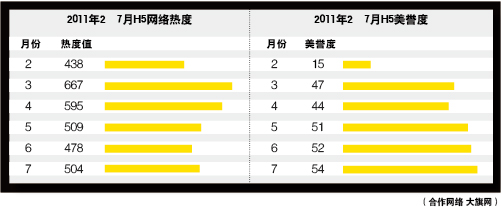 作為國內(nèi)自主品牌SUV的領(lǐng)跑者,長城哈弗H5 2011年2月至7月在大旗網(wǎng)的網(wǎng)絡(luò)熱度呈相對(duì)均衡的態(tài)勢(shì),最高值出現(xiàn)在3月,最低值出現(xiàn)在2月,其他幾個(gè)月的熱度值均在這一區(qū)間內(nèi)波動(dòng)。美譽(yù)度方面,H5的數(shù)據(jù)整體一路上揚(yáng),最高值出現(xiàn)在7月,是最低值2月的3.6倍。這樣的數(shù)據(jù)表明,在消費(fèi)者中,H5擁有不錯(cuò)的口碑。