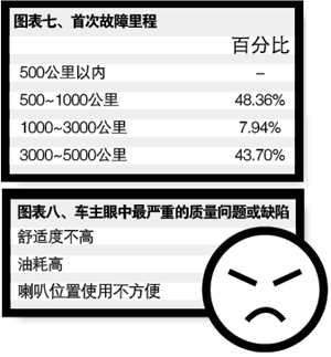 可靠性是一個(gè)與時(shí)間息息相關(guān)的概念,因此對(duì)一款車型出現(xiàn)首次故障的時(shí)間或行駛里程的統(tǒng)計(jì)也具有實(shí)際意義。H30 CROSS的首次故障里程發(fā)生在500~1000公里和3000~5000公里的占比相對(duì)較大,數(shù)值分別為48.36%和43.70%,發(fā)生在1000~3000公里的占比為7.94%(見表七)。雖然這樣的表現(xiàn)與以往受調(diào)查車型的表現(xiàn)相比顯得中規(guī)中矩,但對(duì)于自主品牌來說,消費(fèi)者更加希望以親民的價(jià)格購(gòu)買到質(zhì)量、可靠性過硬的產(chǎn)品,這也是自主品牌企業(yè)日后做強(qiáng)做大的根本。