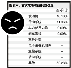 就有故障反映的車輛來看,出現(xiàn)問題的部位主要集中在發(fā)動機、傳動系統(tǒng)、車內(nèi)部及內(nèi)飾以及剎車系統(tǒng),不過這些部位所反映的故障比例整體均保持在較小的范圍,所占比例分別為18.18%、11.36%、9.09%和9.09%(見表六)。而且,在故障反映比例相對最高的發(fā)動機系統(tǒng),車主們只是認為發(fā)動機聲音偏大(見表七),而非其他失效性問題。另一個數(shù)據(jù)也顯示,就整體車主投訴的問題來看,他們中的大多數(shù)并沒有選擇進行維修,證明車主反映的一些故障并未影響平日的正常駕駛活動。