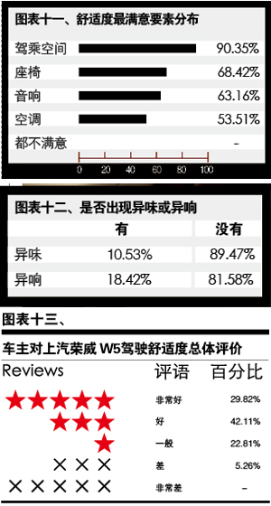 此次調(diào)查中,我們還針對榮威W5的“異響”和“異味”問題進行了調(diào)查。在針對“這款車在行駛過程中(包括剎車時)是否有異常響動”這一選項中,18.42%的車主選擇了“有”,而81.58%的車主則選擇了“沒有”。在回答“這款車的內(nèi)飾是否有困擾您的異味問題”的選項時,只有10.53%的車主作了肯定選擇,而89.47%的車主認為沒有異味(見表十二)。綜合來看,榮威W5在兩異問題上的表現(xiàn)不錯,隔音降噪的水準也在同級車中處于很高水平,而對異味的管控則證明其在內(nèi)飾用料以及零部件做工上擁有較高的品質(zhì)保障。