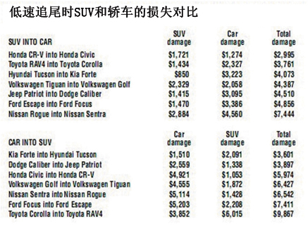 雖然美國公路安全保險協(xié)會(IIHS)此次的調(diào)查結(jié)果是為了證明SUV與轎車低速碰撞事故造成的損失遠高于轎車之間的同等碰撞事故損失,不過從此次碰撞數(shù)據(jù)上看,由于SUV的高保險杠設(shè)計,無論是它追尾轎車還是被轎車追尾,多數(shù)轎車的損失更多。(有關(guān)SUV近期在中國市場的表現(xiàn)和可靠安全口碑請參閱本期封面故事)