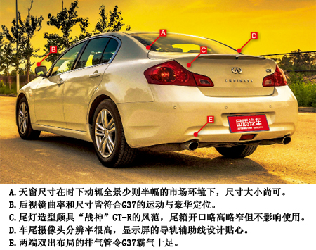 比肩C級車的尺寸,能在駕駛與操控上找到頗多370Z的影子,而且做工、用料、乘坐舒適性方面,又能比肩眾多更高級別的豪華品牌車型,這點令我頗為滿意,況且作為高端豪華品牌的英菲尼迪G37,在電子科技裝備上,除了全英文的各式按鍵外,也很難找到瑕疵。前排寬大的座椅墊與靠背寬厚而肥碩,體重兩百斤的大漢都能輕松體會到坐入其中的寬厚與舒適,只是一旦你的激情操控神經(jīng)被激活,你會更希望它能帶來類似370Z那樣的包裹感與橫向穩(wěn)定感,但是日常駕駛的舒適性,也不是370Z所能給予的。