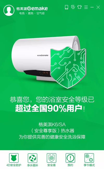 為了保證讓用戶享有一個安心、放心的沐浴體驗,17年初,格美淇迎合新一代消費主體訴求,創(chuàng)新性推出了健康系列K6/SA熱水器,這款主打“安全+健康”的產(chǎn)品一經(jīng)上市就受到全國各地眾多用戶的青睞。