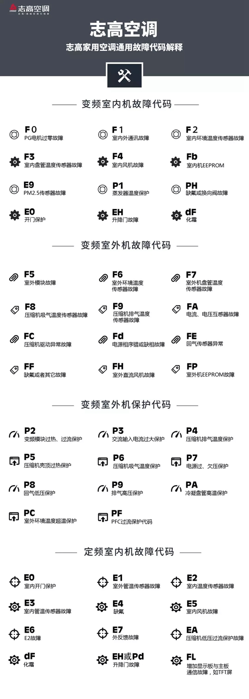 莫慌,故障代碼的出現(xiàn),為機(jī)器故障的維修提供方便快捷的故障信息,也方便自檢空調(diào)的真假故障。有一些小故障,動(dòng)動(dòng)手分分鐘就能解決掉哦。收下這份志高空調(diào)故障代碼,查詢不求人,一鍵打開新世界大門!