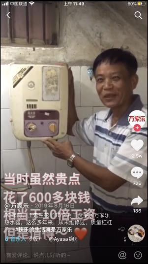 在“尋老友、尋初戀”的以舊換新活動(dòng)中,廣西的王先生家里的熱水器已使用了30年,他表示:“萬(wàn)家樂(lè)這個(gè)牌子很可以,用了幾十年,當(dāng)時(shí)雖然貴點(diǎn),花了600多塊錢(qián),相當(dāng)于(當(dāng)時(shí))10倍工資,但是值得!”