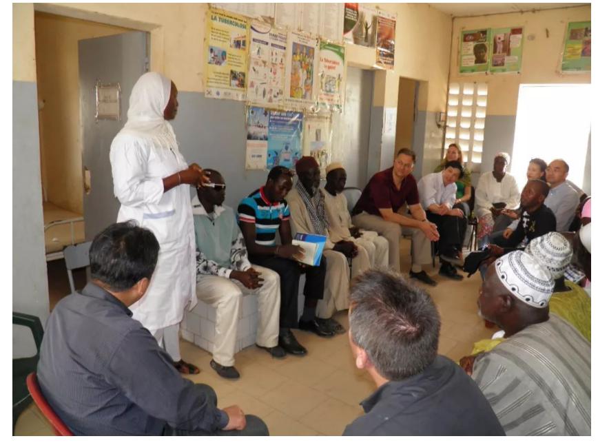 李蔚(圖中右側(cè))赴塞內(nèi)加爾鄉(xiāng)村診所,與當(dāng)?shù)匦l(wèi)生員交流Arktek使用情況。