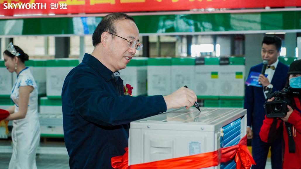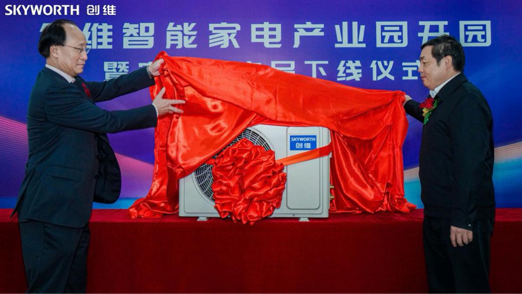 滁州市市長許繼偉(右)和創(chuàng)維集團總裁劉棠枝(左) 為第一臺下線的空調(diào)揭幕
