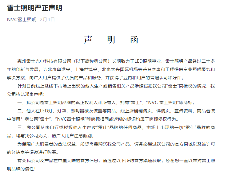2月4日,雷士照明發(fā)布《聲明函》表示:“我公司是雷士照明品牌的真正權(quán)利人和所有人,擁有‘雷士’‘NVC雷士照明’等商標(biāo)?!辈⑧嵵靥嵝眩骸盀楸U蠌V大消費(fèi)者的合法權(quán)益,如您需要購(gòu)買(mǎi)我公司產(chǎn)品,請(qǐng)務(wù)必通過(guò)我公司的官方商城以及被許可的經(jīng)銷(xiāo)商等渠道進(jìn)行購(gòu)買(mǎi)。”