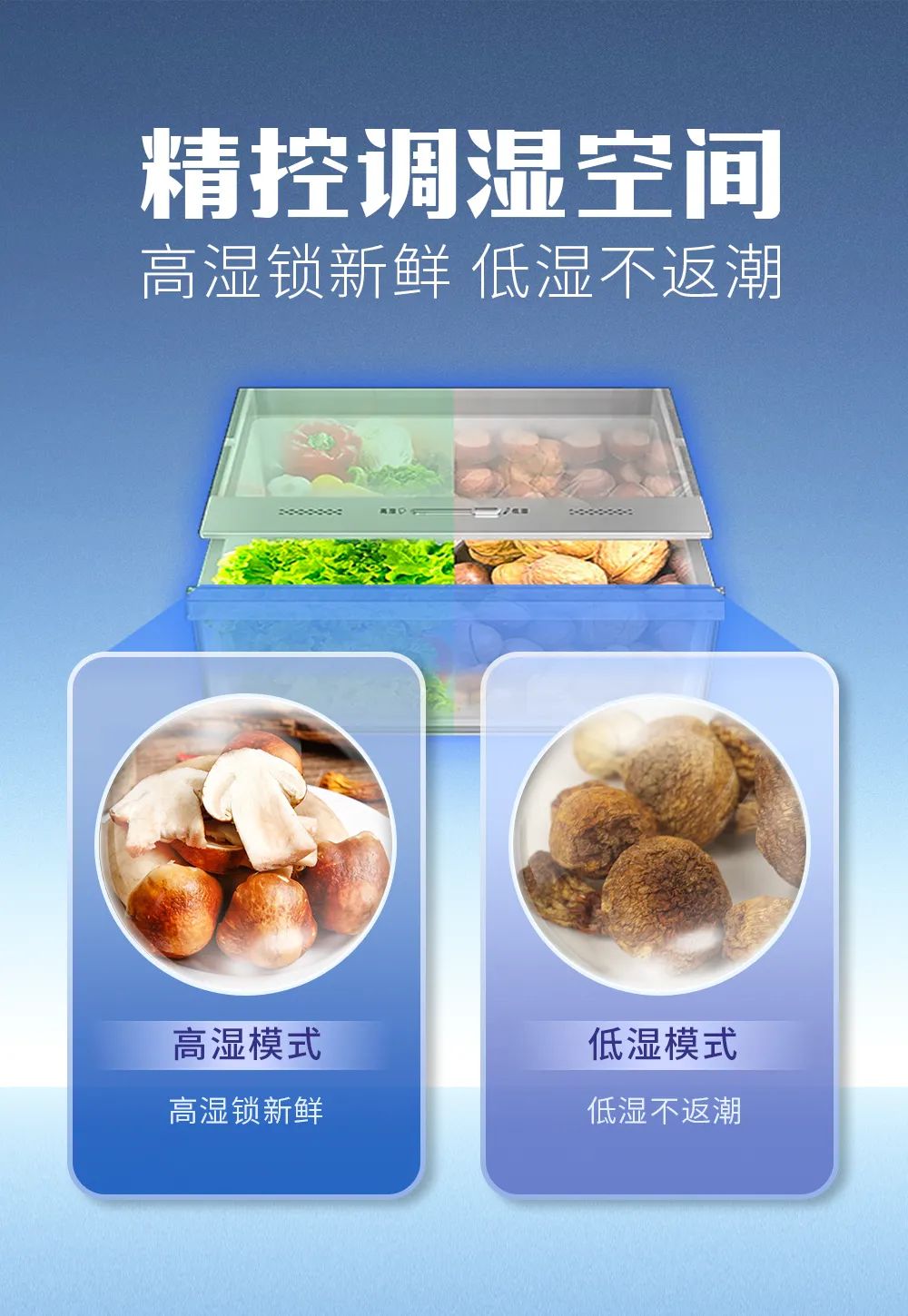 這款冰箱的精控調(diào)濕空間支持低濕、中濕、高濕三檔調(diào)濕,儲(chǔ)存新鮮松茸時(shí)建議調(diào)至高濕模式,松茸久存不變干,可以更長久地保持新鮮。如果要儲(chǔ)存干貨松茸則可以調(diào)至低濕模式,然后把密封好的干松茸放進(jìn)里面,干貨不返潮,食材品質(zhì)更好。