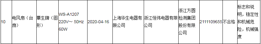 抽查情況顯示,標(biāo)稱上海華生電器有限公司生產(chǎn)的華生牌電風(fēng)扇(臺扇)(規(guī)格型號:WS-A1207 220V~ 50Hz 60W,生產(chǎn)日期/批號:2020-04-16)標(biāo)志和說明、穩(wěn)定性和機械危險、機械強度三項均不合格。承檢機構(gòu)為浙江方圓檢測集團股份有限公司。