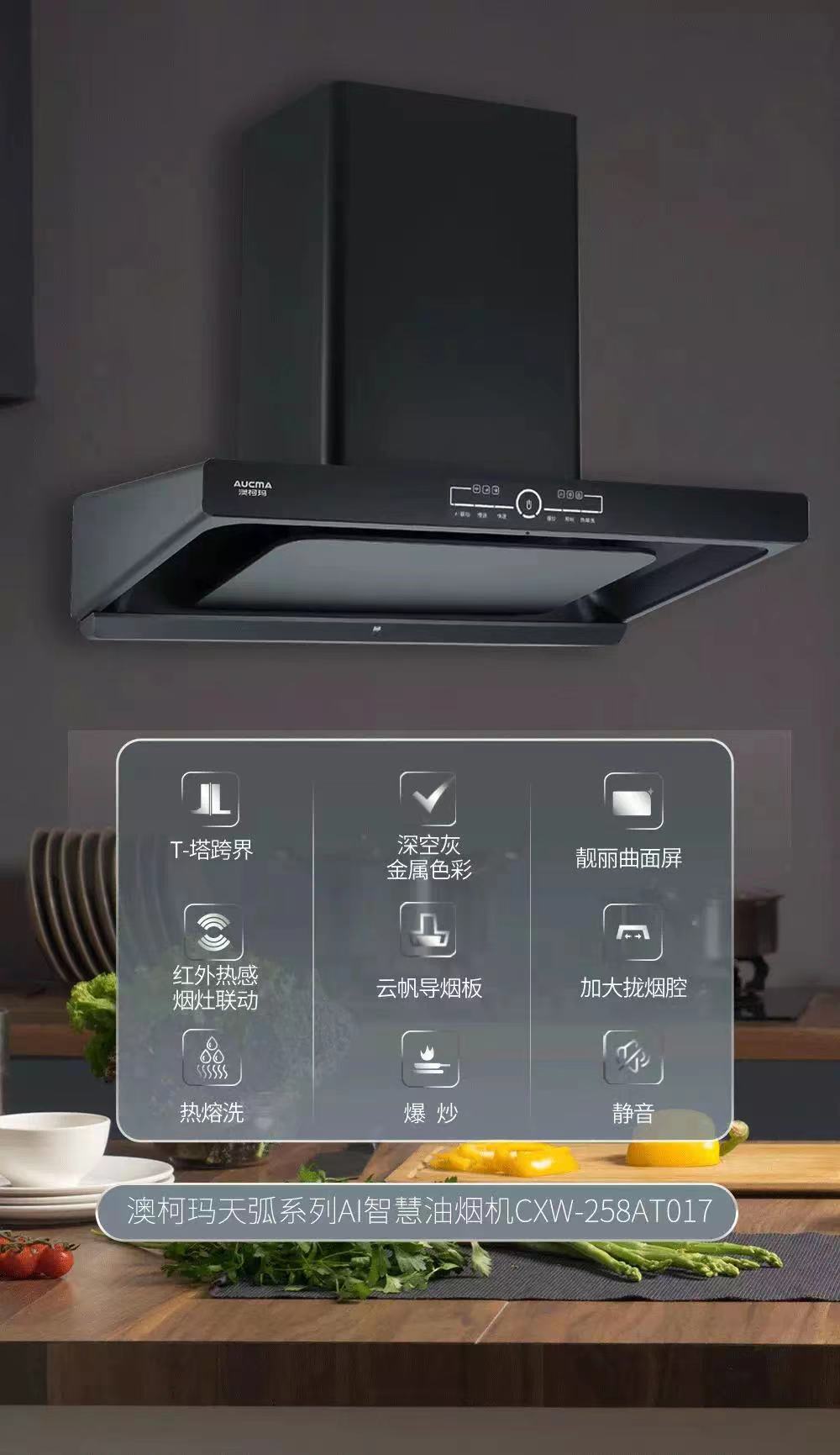 澳柯瑪天弧系列AI智慧油煙機(jī)CXW-258AT017的T-塔跨界設(shè)計(jì)在提升攏煙效果之外,也讓油煙機(jī)的外形更富設(shè)計(jì)感。它四個(gè)角弧形倒角圓潤(rùn)美觀,無(wú)論獨(dú)立安裝還是嵌入櫥柜都好看;深空灰金屬色彩烤漆工藝精湛,平整光滑易清潔,美觀又實(shí)用,在各種風(fēng)格的廚房設(shè)計(jì)中都能一眼驚艷。