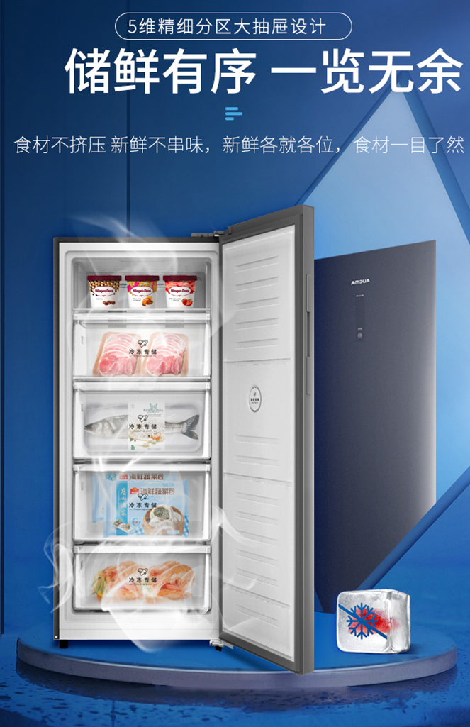 澳柯瑪立式冷柜用隔板和抽屜將整個冷柜劃分為多塊小空間,可以分別存放不同種類的食材。打開柜門,各層食材一目了然,只要拉開對應(yīng)抽屜就能輕松取放所需物品,更不用費力翻找,用起來和冰箱一樣方便。