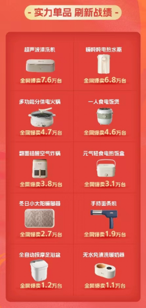 從爆品銷(xiāo)售業(yè)績(jī)來(lái)看,超聲波清洗機(jī)爆賣(mài)7.6萬(wàn)臺(tái)、暖噸噸電熱水瓶銷(xiāo)量超6.8萬(wàn)臺(tái)、多功能分體電火鍋銷(xiāo)量超4.7萬(wàn)臺(tái),不斷涌現(xiàn)出超級(jí)單品,其中最具有代表性的就是電熱水瓶,非常符合當(dāng)代人對(duì)生活品質(zhì)、生活質(zhì)量的升級(jí)性需求。