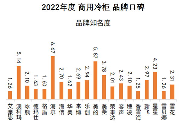 分維度來看:品牌知名度方面,海爾、美的、澳柯瑪位居前三。海爾、美的、澳柯瑪、星星、美菱、新飛在近兩期中均位居前十。樂創(chuàng)、海信、來博、容聲在本期晉升至前十,華美、哈士奇、雪花、統(tǒng)帥則掉出前十。