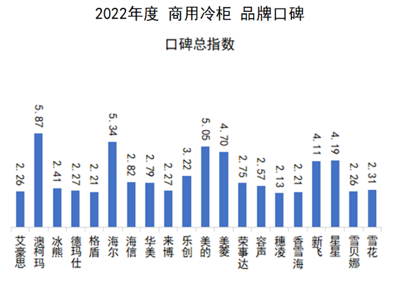 口碑總指數方面,與上期相比,新入榜品牌有冰熊、海信、穗凌、雪貝娜;落榜品牌有哈士奇、睿美、統(tǒng)帥、雪鷗。澳柯瑪、海爾、美的位居前三。澳柯瑪、海爾、美的、美菱、星星、新飛、樂創(chuàng)、華美在近兩期中均位居前十。海信、榮事達在本期晉升至前十,統(tǒng)帥、雪花則掉出前十。