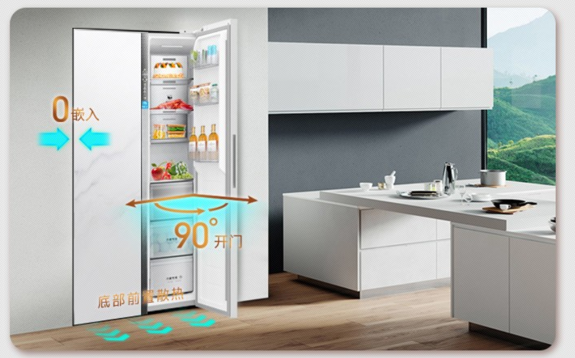 傳統(tǒng)冰箱的嵌入需要在冰箱兩側(cè)預(yù)留約10厘米的散熱空間,容易浪費空間、藏污落灰、異物難取。為滿足不同家庭的差異化使用需求,澳柯瑪零嵌冰箱對常規(guī)冰箱嵌入模式進(jìn)行了創(chuàng)新突破:610mm超薄箱體、90°全景開門、前向底部散熱系統(tǒng),兩側(cè)無需預(yù)留空間,不僅杜絕了衛(wèi)生死角問題,而且大大減小了冰箱放置所需空間,美化了整體家居環(huán)境。此外,隱藏式門鉸鏈設(shè)計能夠讓冰箱零距離嵌入櫥柜的同時90°直角開門,不影響抽屜拉取。