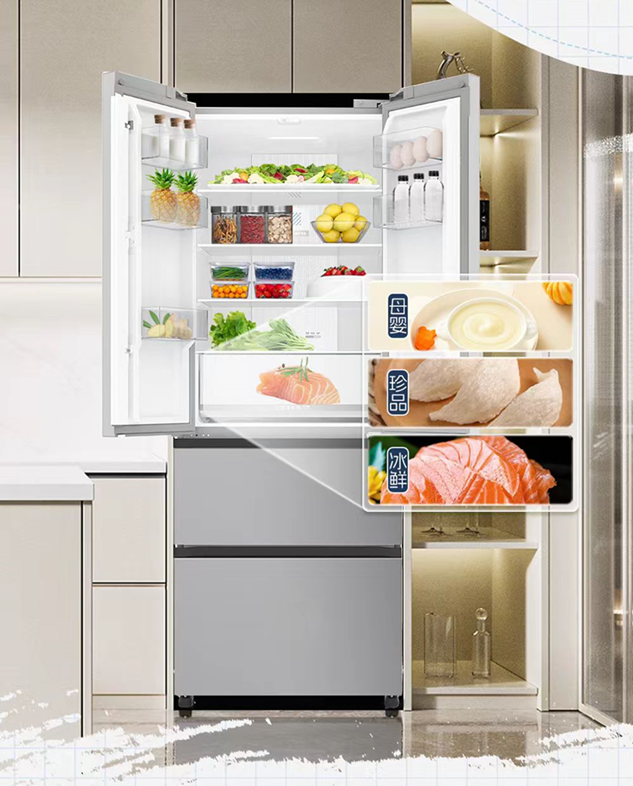 澳柯瑪BCD-430WPGXZ法式四門(mén)冰箱可實(shí)現(xiàn)干、濕、生、鮮等全食材的分類存儲(chǔ),滿足無(wú)論是多孩家庭還是三代同堂的儲(chǔ)鮮需求。冰箱內(nèi)部劃分為寬大冷藏區(qū)、果蔬保鮮區(qū)、冷凍生鮮區(qū)、冷凍成品區(qū)等多個(gè)不同區(qū)域,在常規(guī)的冷凍和冷藏之外,還有一個(gè)大大的變溫抽屜,對(duì)母嬰、臻品、冰鮮等都可隨需而變。