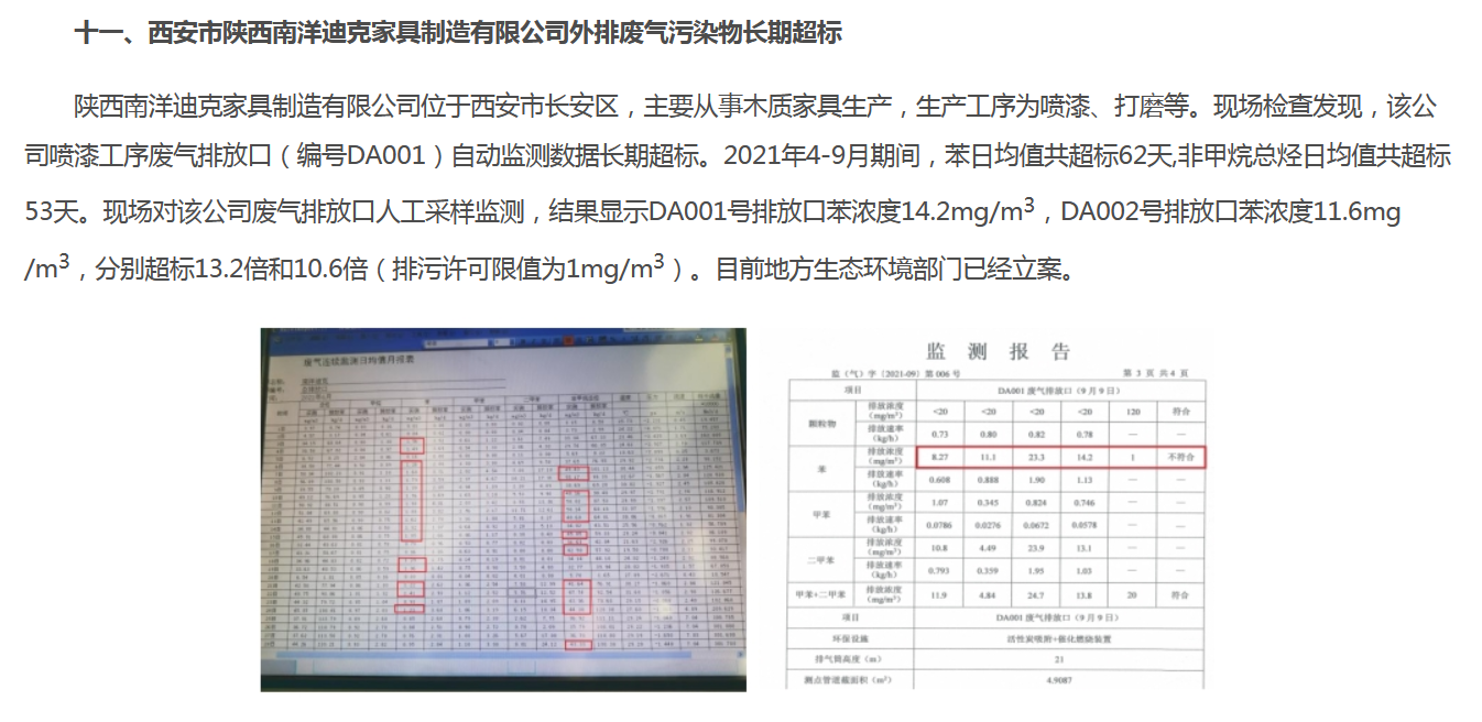 中國質(zhì)量新聞網(wǎng)訊 日前,生態(tài)環(huán)境部曝光一批具有突出生態(tài)環(huán)境問題的違規(guī)企業(yè)。其中,西安市陜西南洋迪克家具制造有限公司長期違規(guī)向外界排放污染物,且超標多達十數(shù)倍。目前,當?shù)厣鷳B(tài)環(huán)境部門已對其立案調(diào)查。