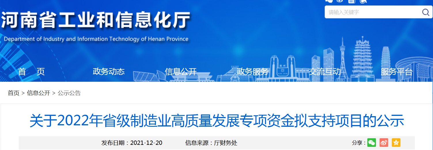 中國質(zhì)量新聞網(wǎng)訊 日前,河南省工業(yè)和信息化廳發(fā)布《關(guān)于2022年省級制造業(yè)高質(zhì)量發(fā)展專項(xiàng)資金擬支持項(xiàng)目的公示》。