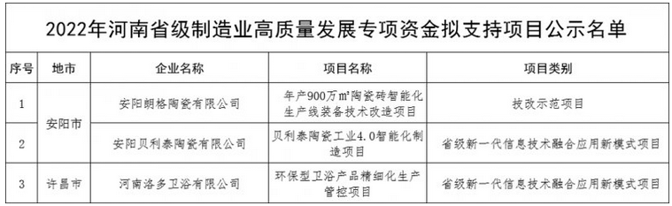 本次公示的名單中,確定河南中小在線信息服務(wù)有限公司等514個項(xiàng)目為2022年省級制造業(yè)高質(zhì)量發(fā)展專項(xiàng)資金擬支持項(xiàng)目。其中,安陽朗格陶瓷有限公司、安陽貝利泰陶瓷有限公司、河南洛多衛(wèi)浴有限公司3家建陶衛(wèi)浴企業(yè)項(xiàng)目入選。