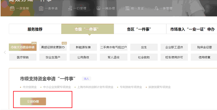 3.選擇“市級支持資金申請一件事”,選擇“立即辦理”;