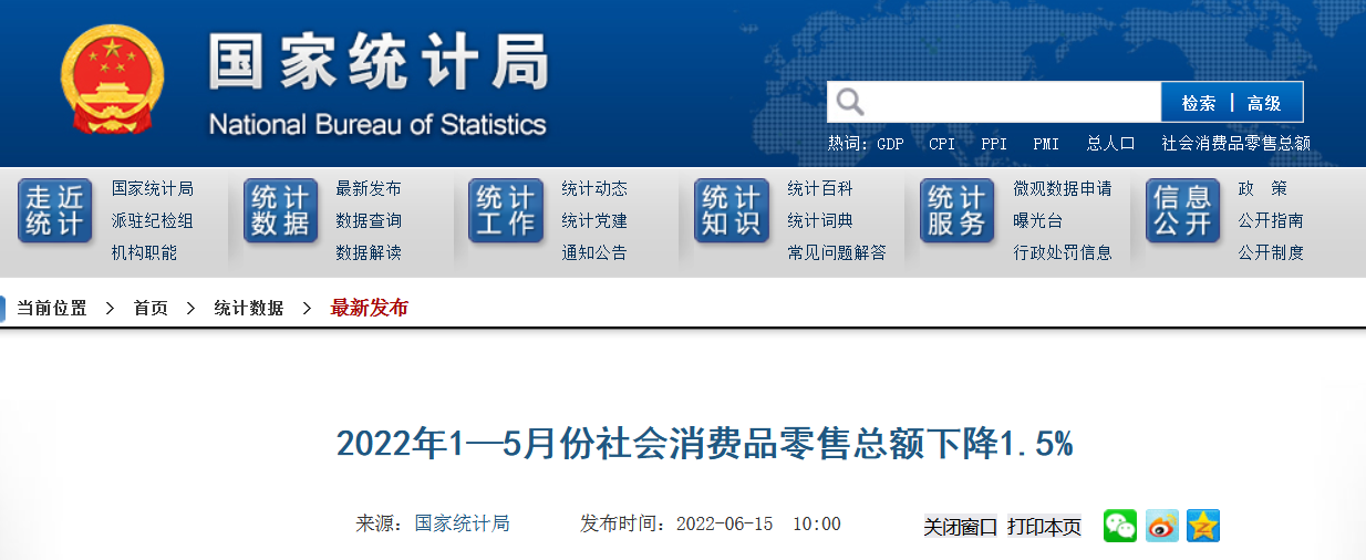 中國(guó)質(zhì)量新聞網(wǎng)訊 近日,國(guó)家統(tǒng)計(jì)局發(fā)布《2022年1-5月份社會(huì)消費(fèi)品零售總額下降1.5%》的數(shù)據(jù)。