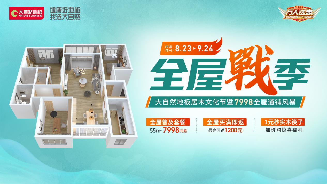 大自然地板在8月23日-9月24日開啟“全屋戰(zhàn)季——大自然地板居木文化節(jié)暨7998全屋通鋪風(fēng)暴”活動,全屋通鋪55㎡僅需7998元起,以實際行動讓家回歸自然本質(zhì)。