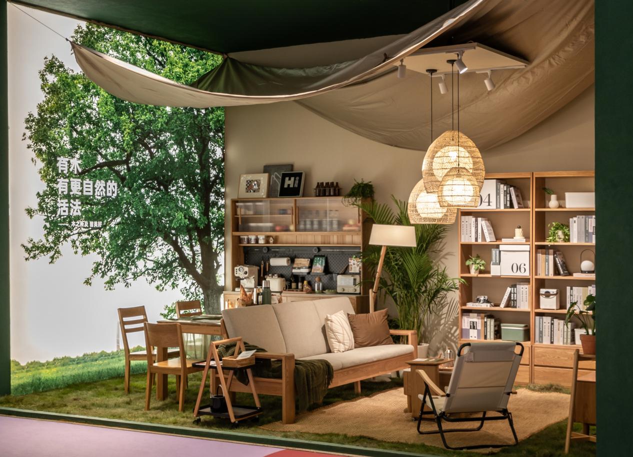 同時,源氏木語沒有忘記實木材料的“源起”,于展館外立面陳列著的戶外露營系列產(chǎn)品,旨在讓實木家具走進戶外,回歸自然,讓露營生活成為它的“歸處”。洪洋認為,“可持續(xù)”的產(chǎn)品思路,向來是源氏木語設(shè)計的靈感來源:讓實木家具在任何時間、任何地點打造綠色健康的當代生活方式。