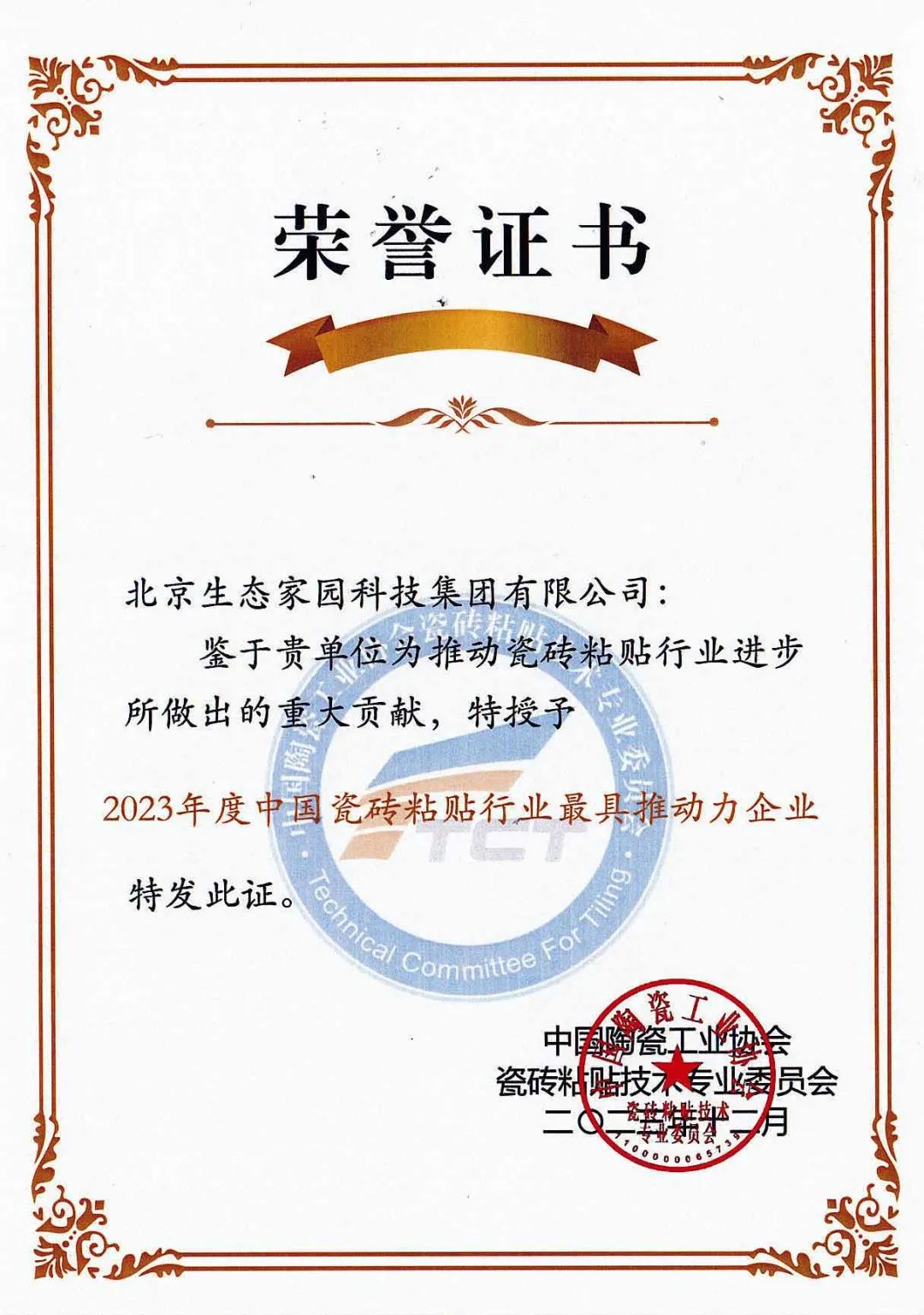 榮獲2023年度中國(guó)瓷磚粘貼行業(yè)“最具推動(dòng)力企業(yè)”