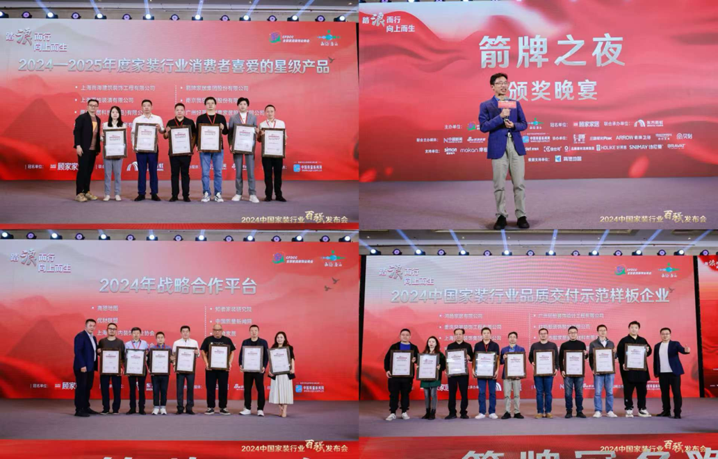 會上,中國家裝行業(yè)各領(lǐng)域表現(xiàn)優(yōu)秀的品牌企業(yè)榮譽頒布。北京天壇整裝、北新建材龍牌集團、金螳螂家、上海百姓裝潢、貝殼整裝、內(nèi)蒙古興泰家裝飾等10家企業(yè)榮獲“中國家居行業(yè)優(yōu)秀品牌企業(yè)黨建工作先進單位”;顧家家居、東方雨虹、箭牌家居榮膺2024“年度家裝行業(yè)突出貢獻獎”;北京業(yè)之峰集團、上海聚通裝飾、深圳名雕裝飾,重慶兄弟裝飾、湖南鴻揚家裝等62家裝企榮獲2024年度“中國家裝百強”;鴻揚家裝、浙江都都裝飾、紅螞蟻裝飾、江蘇錦華裝飾、上海聚通、愛空間、重慶兄弟裝飾等11家企業(yè)榮獲“2024中國家裝行業(yè)品質(zhì)交付示范樣板企業(yè)”;“2024—2025年度家裝行業(yè)消費者喜愛的星級產(chǎn)品”由箭牌家居、上海尚海整裝、厚道家居科技(青島)、西蒙電氣、好萊客等9家企業(yè)獲得;“2024年度家裝行業(yè)年度科技賦能貢獻獎”被頒給貝刻云視智慧工地;“2024年度中國家裝行業(yè)優(yōu)秀家裝企業(yè)”“2024年度百強裝企優(yōu)秀合作品牌Top30”“2024年戰(zhàn)略合作平臺”等榮譽也分別授予各領(lǐng)域優(yōu)秀企業(yè)。